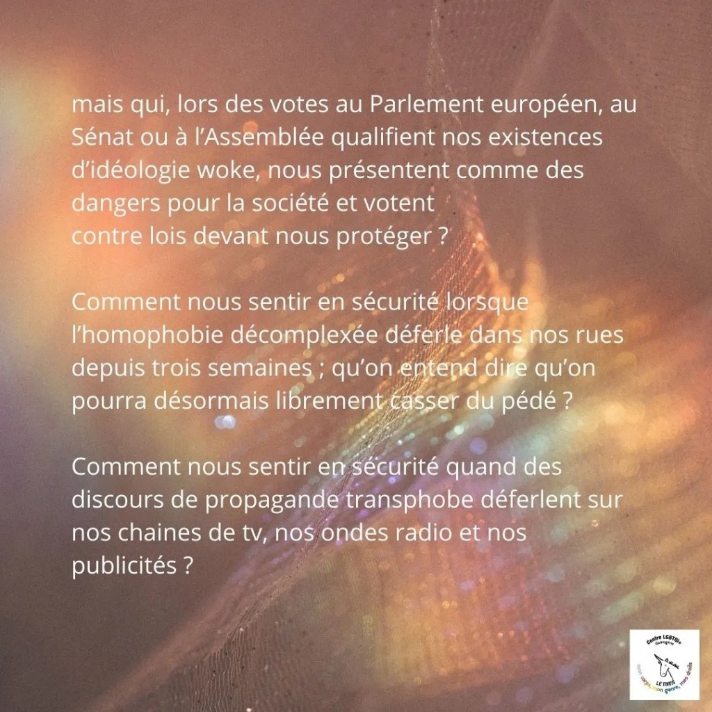 En revanche, il y a des acteurs et partis politiques qui politisent nos identités et notre existence, en mettant nos droits en question et en tenant des propos LGBTphobes; des propos LGBTphobes qui ne sont pas de question d’opinion ou de droite ou de gauche, mais qui représentent un délit.