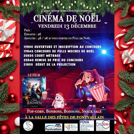Nous sommes ravi.es de vous annoncer une soirée de cinéma de Noël le vendredi 13 décembre à la salle des fêtes de Pontvallain!