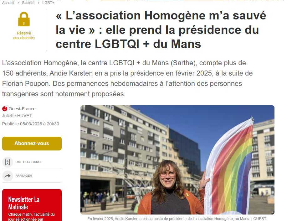 https://www.ouest-france.fr/societe/lgbt/lassociation-homogene-ma-sauve-la-vie-elle-prend-la-presidence-du-centre-lgbtqi-du-mans-aba2c4d8-f9b0-11ef-a6a4-567d76e1951c?fbclid=IwY2xjawI47ChleHRuA2FlbQIxMAABHWRBLSVgX-C7ZUVpSP9_DEOqiXg0OyEVe6dR_tQP14y6_Fc-eeJzY_hGVw_aem_iDjWVlW9rQUkqnrZ-z0czQ