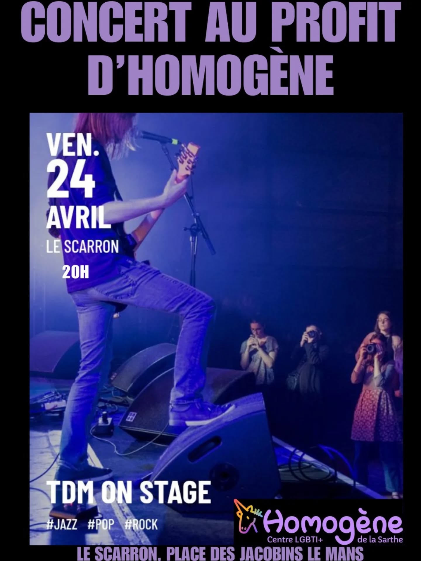 Nous vous retrouvons le 24 avril au Scarron avec la compagnie TDM qui accompagne et conseille les groupes amateurs sarthois dans leur épanouissement artistique. Vous aurez le plaisir de découvrir les groupes accompagnés cette année. Les entrées (prix libre à partir de deux euros) seront reversées à Homogène.Nous serons présents pour vendre des goodies et pour présenter l’association. Au plaisir de vous voir à partir de 20h!